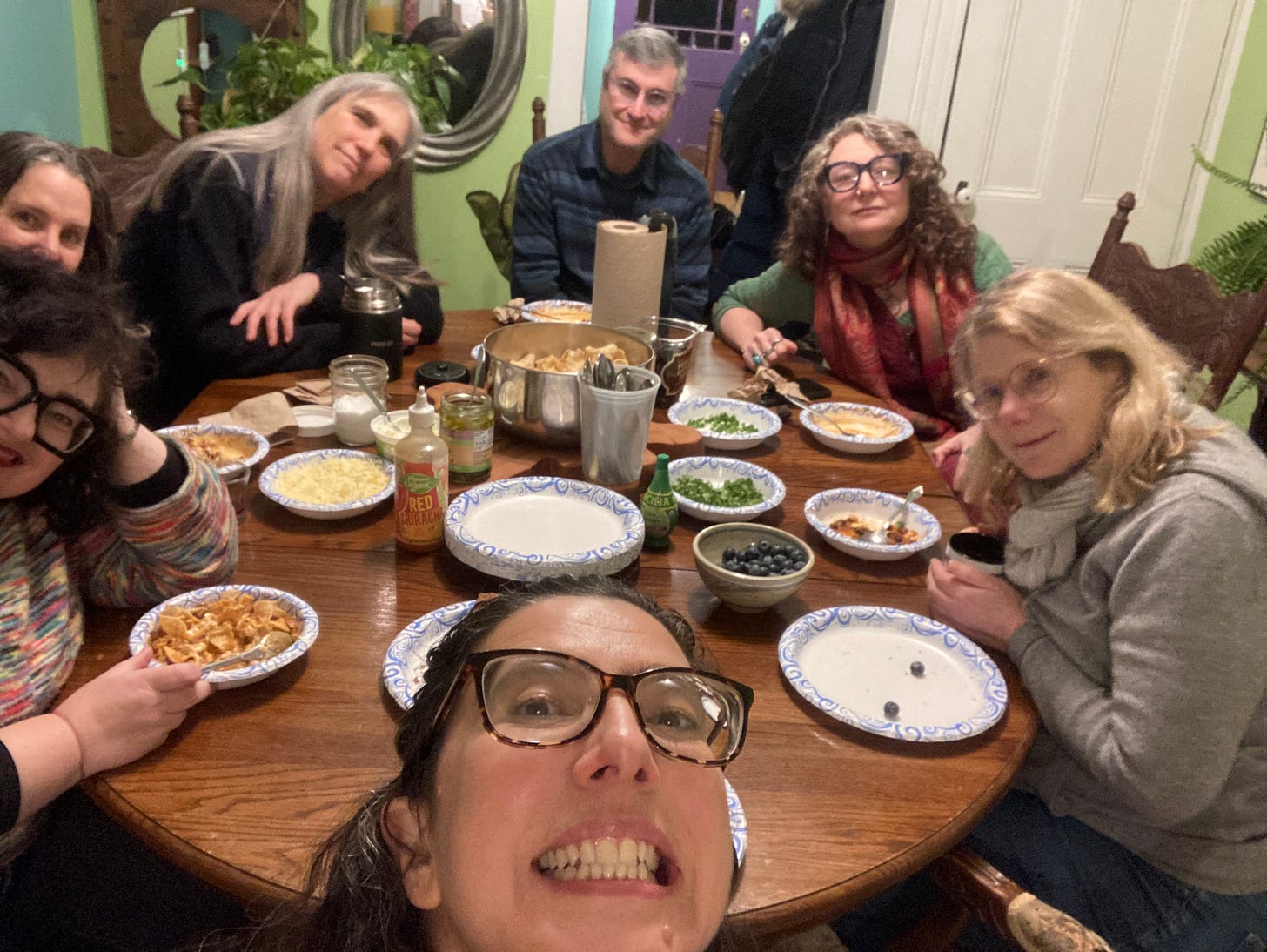 Y’all! It was lovely. Despite February weather, six whole people came— two close friends, two social friends, and two folks I barely know. Just enough to fit around my table. Lively conversation ranged from politics to astrology to kids to books and more. A friend talked about the course she taught this past fall on trans utopias and folks noted titles to read later. The same friend posed a question about local city government and another friend referred her to a video series on Instagram made by her partner, recently elected to our city council, that explained the answer. Many of us saved that link, so excited to get informed and engaged.